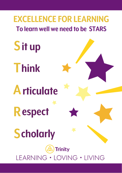 Use of Trinity Language (age appropriate) reinforces expectations at all stages of session - ‘never give up’; ‘Terrific Trinitarian’; ‘open minded’; ‘knowledgeable’; ‘insightful’; ‘caring’; ‘principled’; ‘resilient’; ‘reflective’; ‘courageous’; ‘independent’ |