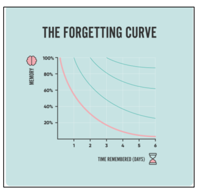 The curve demonstrated the rate at which information is forgotten over time if we don’t attempt to retain it. Learners will rapidly lose their memory of learnt knowledge in a matter of days or weeks unless the information is consciously reviewed. Some studies suggest that humans forget approx 50% of new information within an hour of learning it. That goes up to an average of 70% within 24 hours.