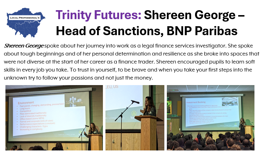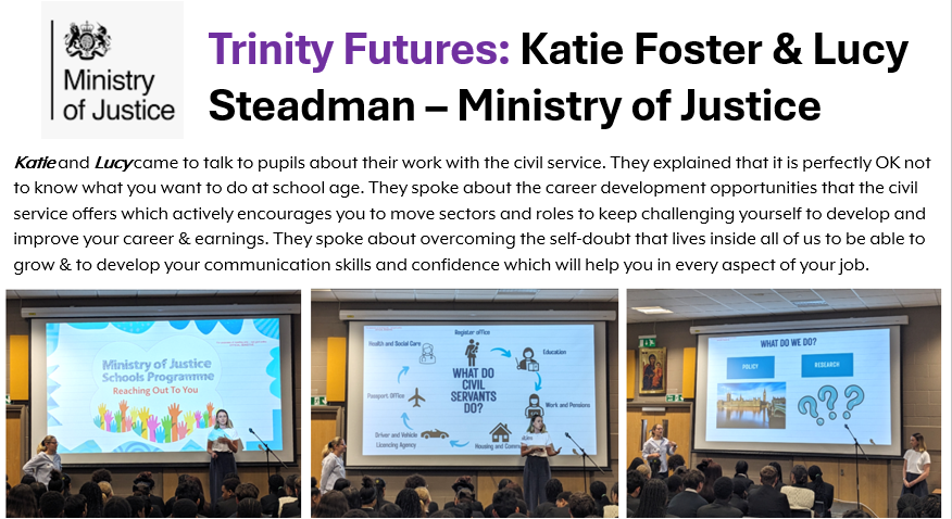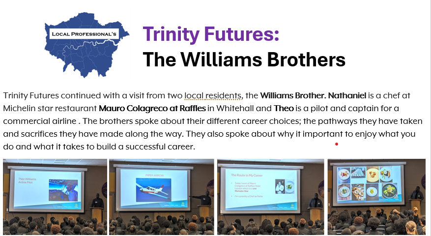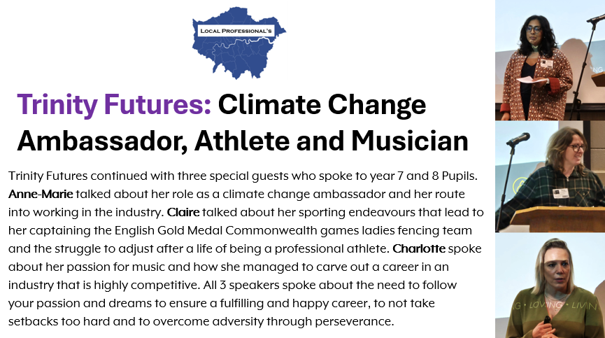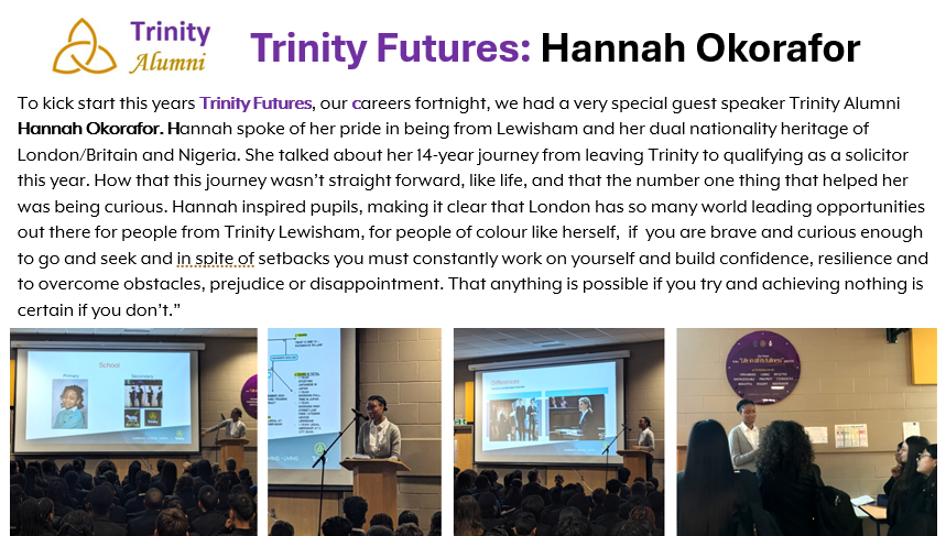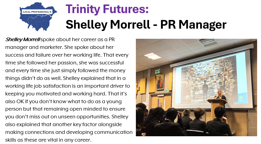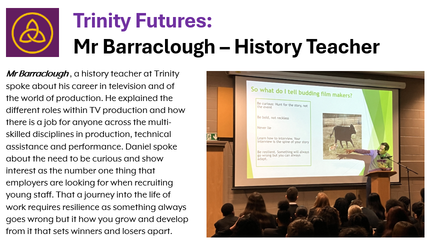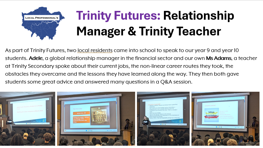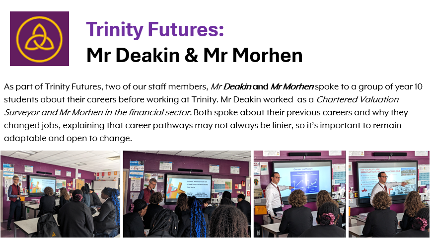 Trinity Futures is a month-long career event. Each year, in March, we invite people from the local area and alumni to share their wisdom about decisions they made that led them from school age to where they are now in their careers. Our focus on using local people and alumni allows pupils to see themselves in the careers discussed. Pupils feel the stories are more relatable as the starting points are similar, this makes Trinity futures a truly engaging and transformational experience for pupils. Every year we have over 20 guest speakers from a broad range of careers, from lawyers to electricians, doctors to hairdressers. There is something for everyone to be inspired by and aspire towards.