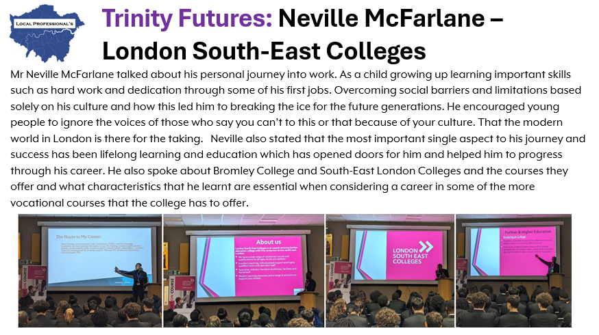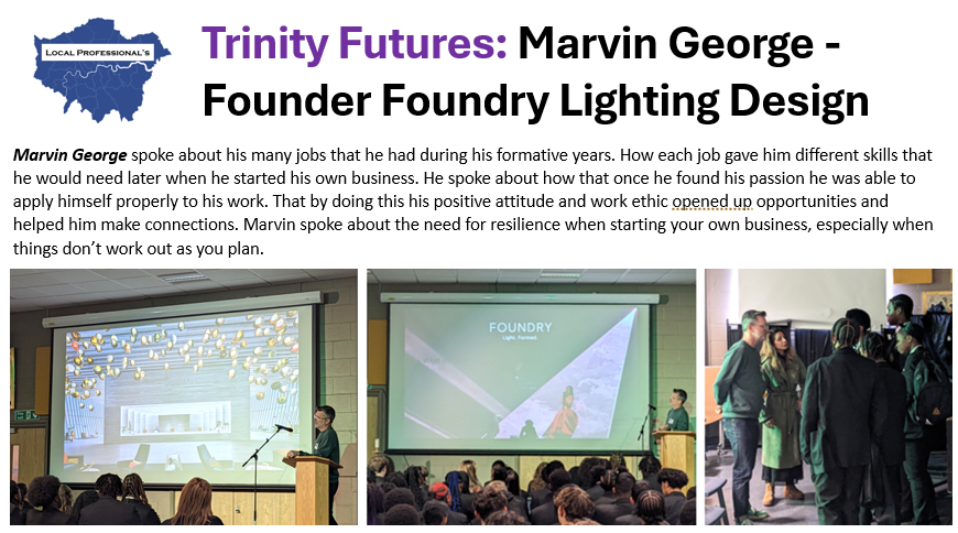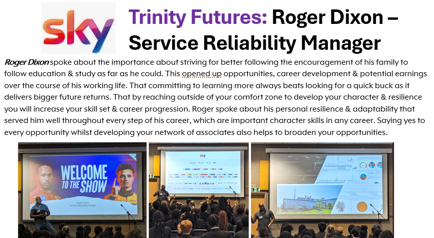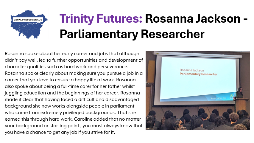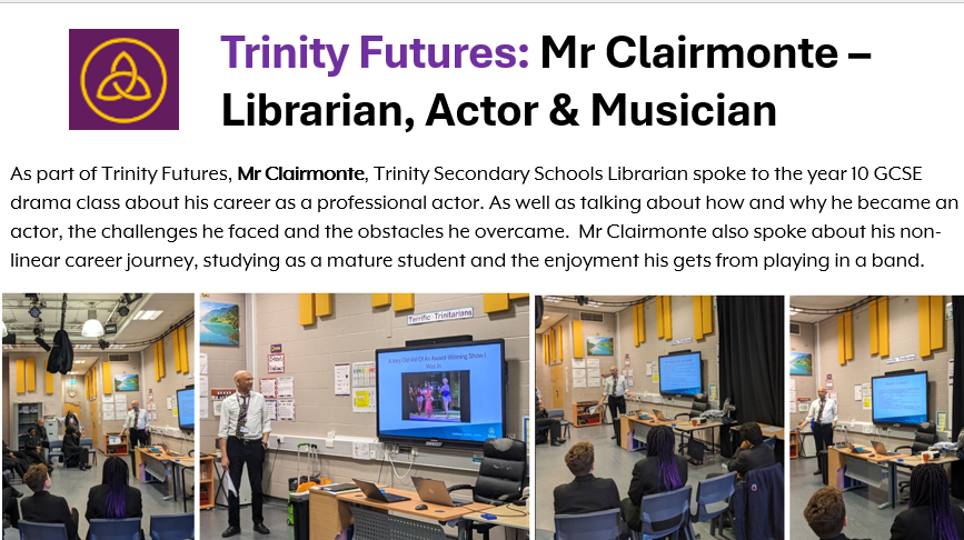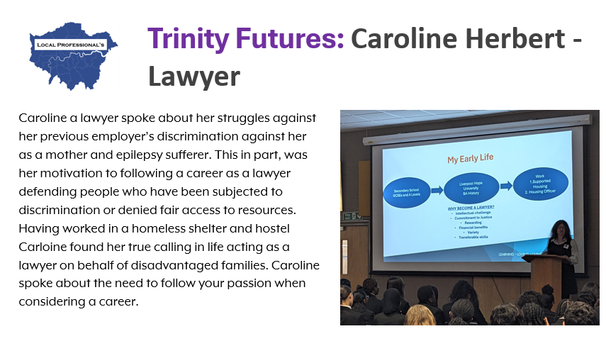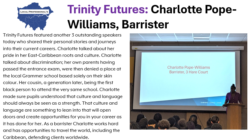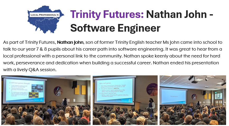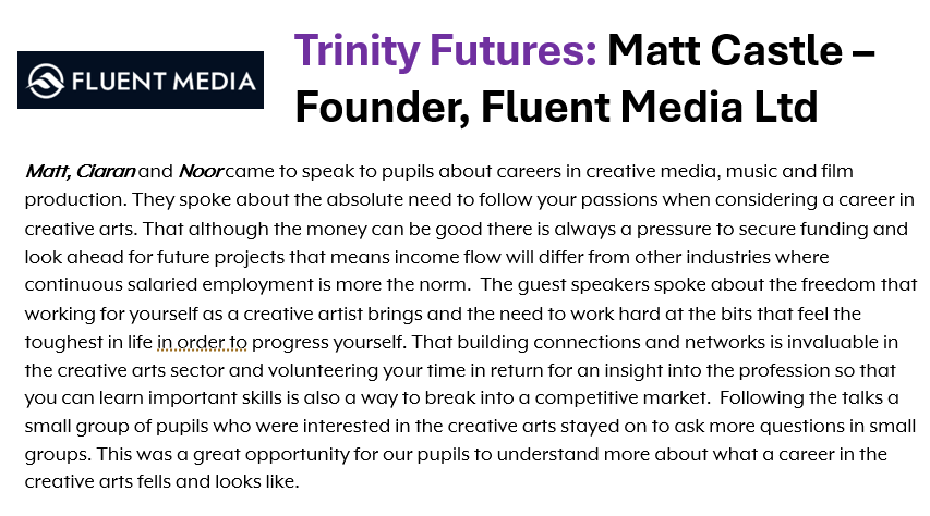 Trinity Futures is a month-long career event. Each year, in March, we invite people from the local area and alumni to share their wisdom about decisions they made that led them from school age to where they are now in their careers. Our focus on using local people and alumni allows pupils to see themselves in the careers discussed. Pupils feel the stories are more relatable as the starting points are similar, this makes Trinity futures a truly engaging and transformational experience for pupils. Every year we have over 20 guest speakers from a broad range of careers, from lawyers to electricians, doctors to hairdressers. There is something for everyone to be inspired by and aspire towards.